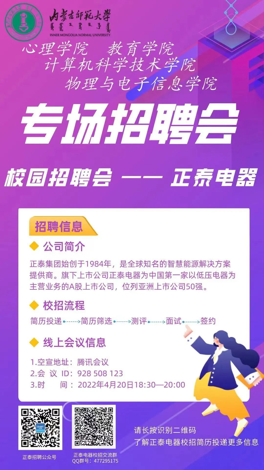 为深入贯彻党中央、国务院“稳就业”“保就业”决策部署,进一步做好毕业生就业工作,拓宽就业渠道,实现高质量就业, 4月20日,万象城娱乐awc线路通过校友积极联系正泰电器,面向万象城娱乐awc线路、教育学院、物理与电子信息学院、计算机科学技术学院等召开2022届毕业生线上专场招聘会。