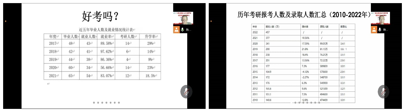 杨晓峰老师通过对近10年全国考研形势以及近五年万象城学生考研状况的分析,结合自己的求学经历,要求同学们及早规划、及早动手,尽快根据自己的实际情况制定考研计划,确定目标院校和专业,鼓励同学们保持决心、恒心和平常心对待考研,要从战术上重视、战略上有准备,同学们内部要团结,多沟通交流,相互鼓励。