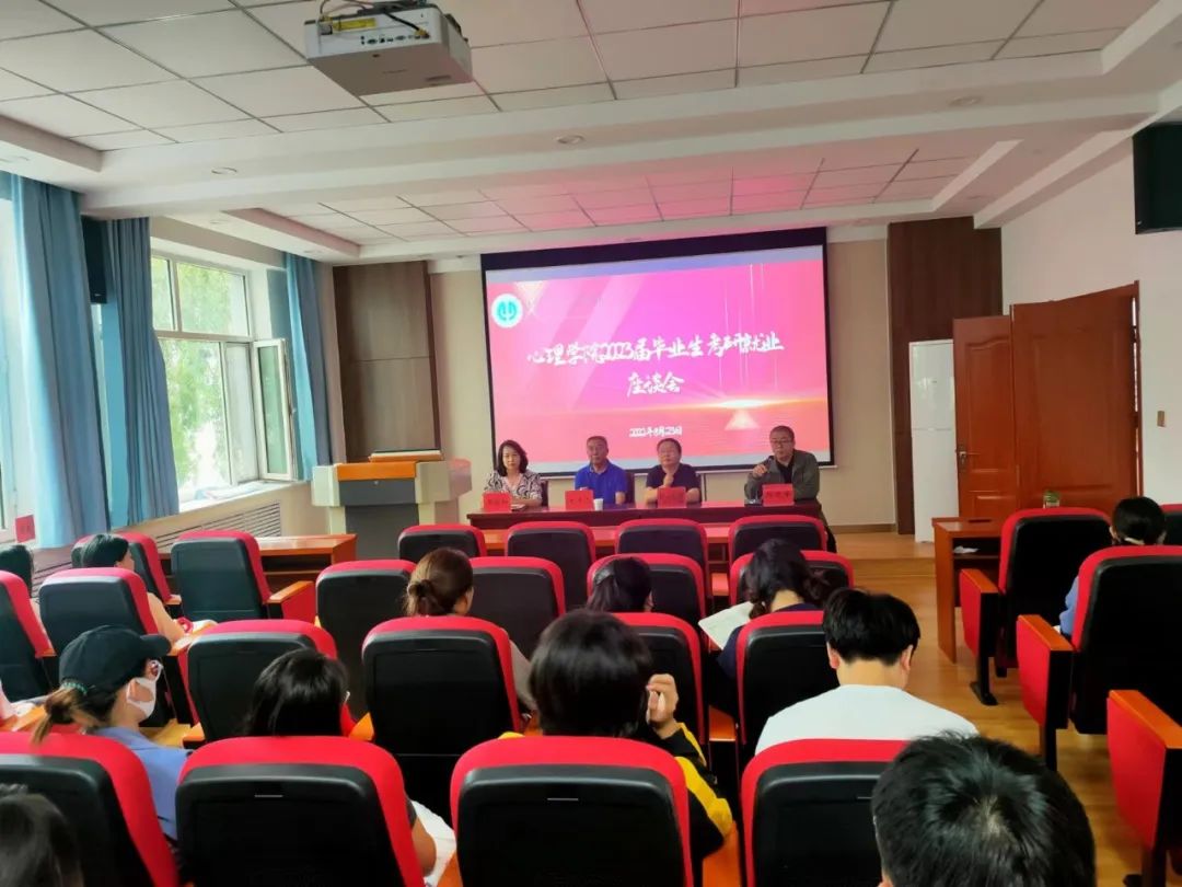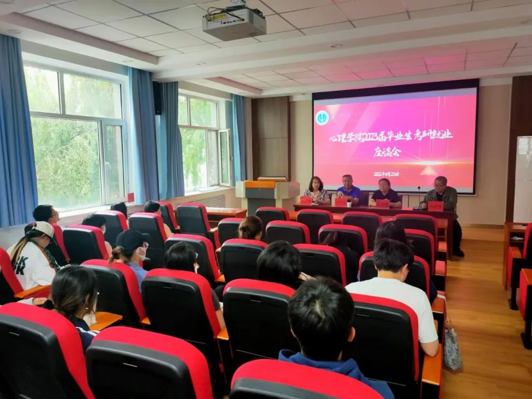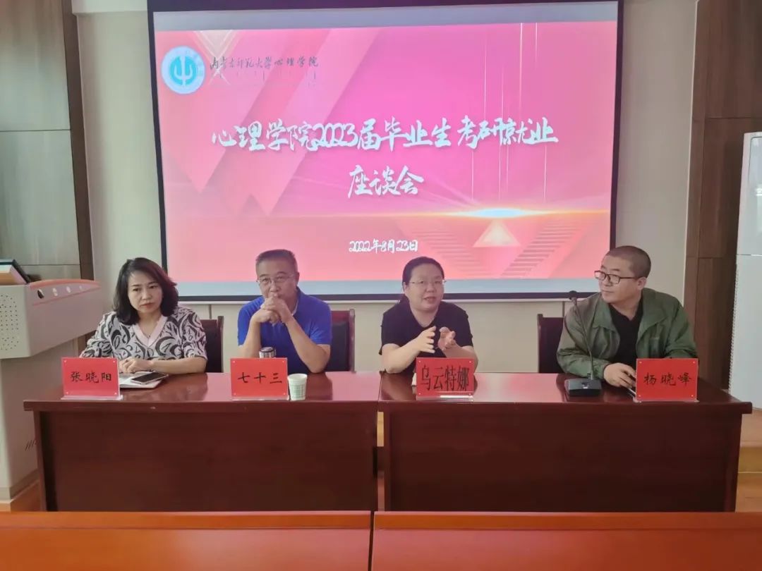 为做好稳就业、保就业工作,8月23日下午,万象城娱乐awc线路召开2023届毕业生考研就业座谈会。学院党委书记七十三、院长乌云特娜、院党委副书记副院长张晓阳及2019级心理学班班主任杨晓峰出席会议,2019级心理学班全体学生参会。