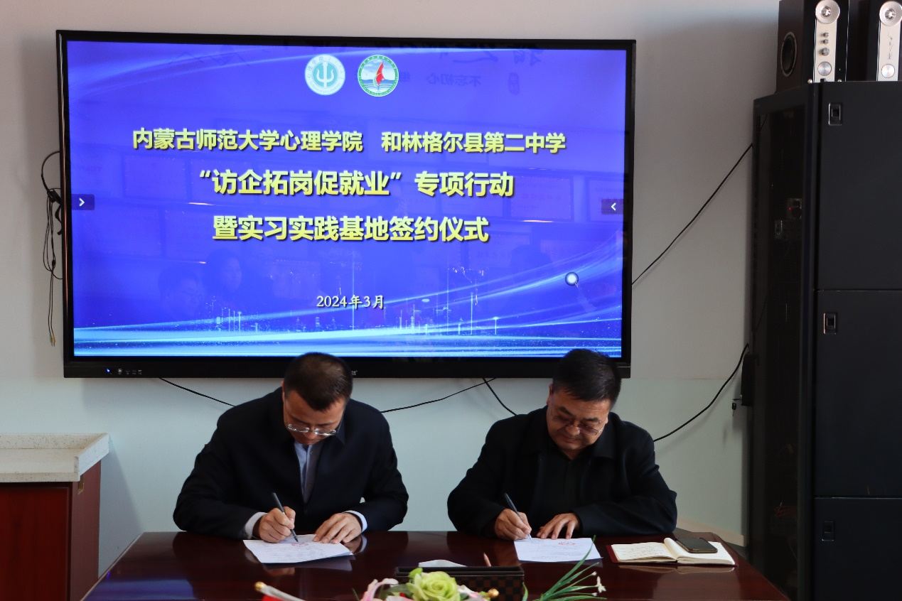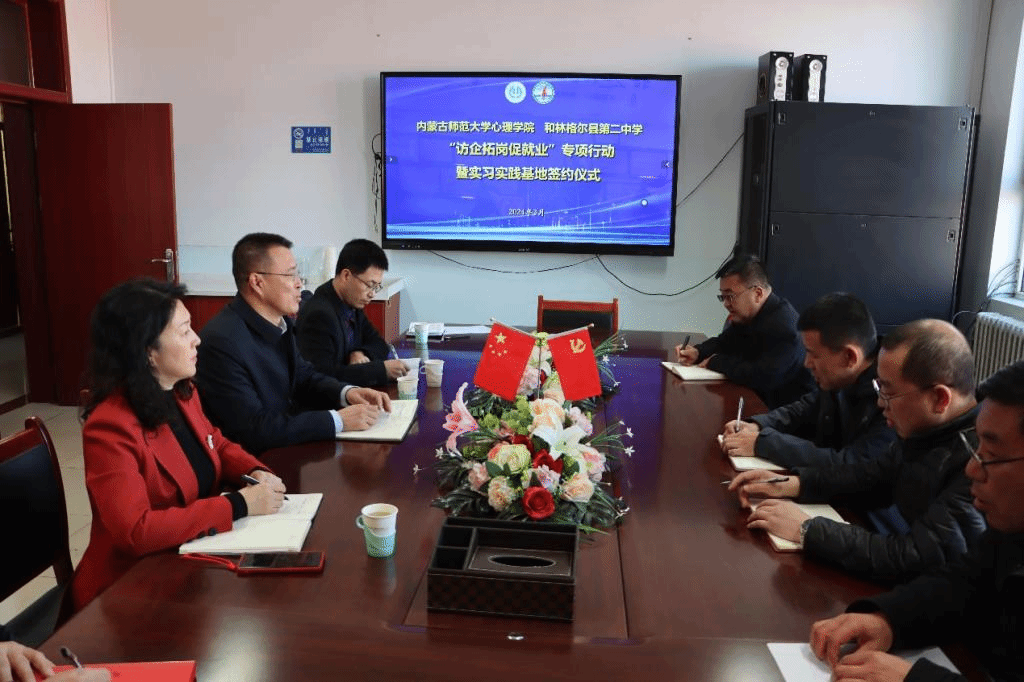为贯彻党中央、国务院、教育部关于高校毕业生就业工作的决策部署,深入了解基础教育用人单位对心理健康教师的岗位需求和选聘条件,提升学院社会心理服务功能,加强师范生教育实践能力的培养和就业工作质量,近日,万象城娱乐awc线路党委书记侯友,院长乌云特娜,副书记、副院长张春林,副院长金童林带队先后赴和林格尔县第一中学、和林格尔县第二中学、呼和浩特市土默特中学开展“访企拓岗促就业”专项行动,并签署实习实践基地建设协议。