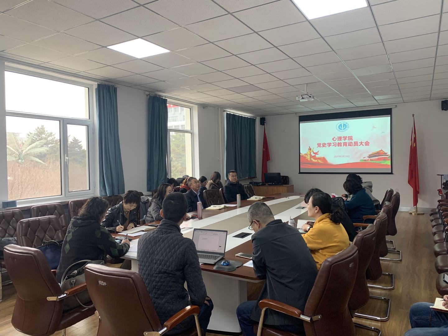 3月18下午心理学院在赛罕校区文史楼217会议室召开党史学习教育动员大会,对学院深入开展党史学习教育进行全面动员部署学院全体教工参加。