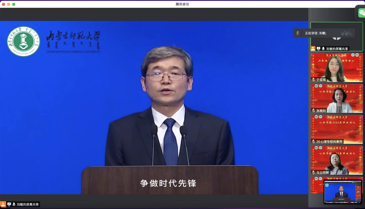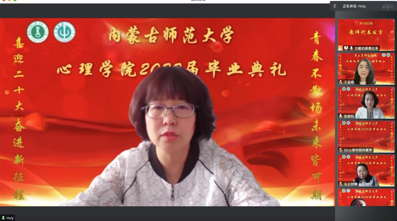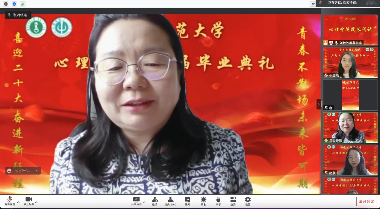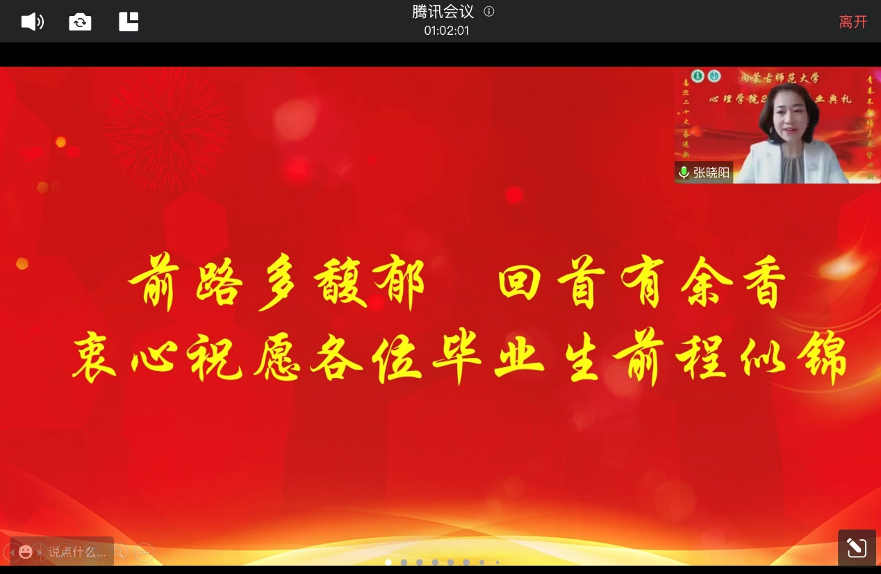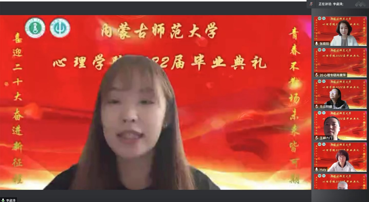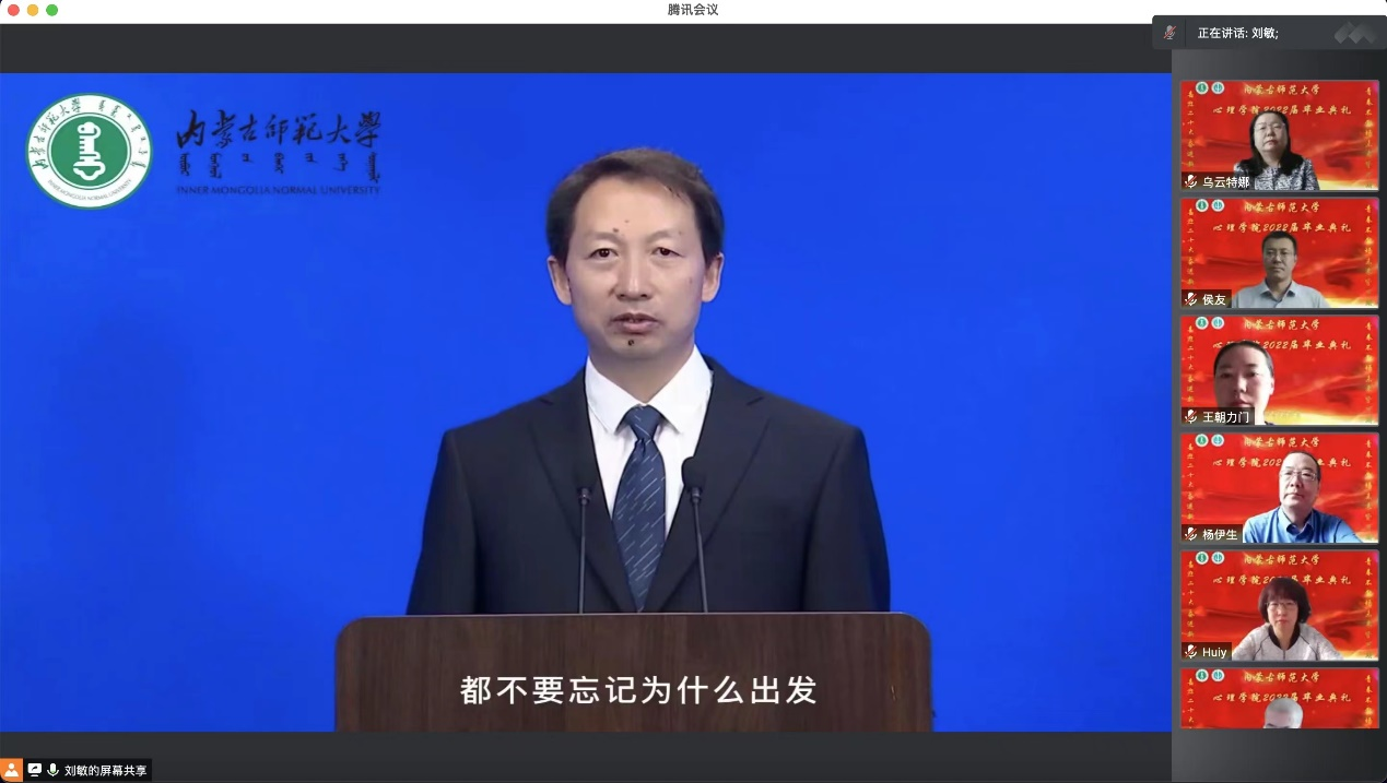 万象城娱乐awc线路院长、博士生导师乌云特娜教授为全体毕业生送上深情寄语。她称赞同学们在疫情的考验之下仍然能够以理性平和的心态去处理问题,殷切嘱托同学们要脚踏实地、不忘初心,也要志存高远。牢记习近平总书记在今年建团百年讲话上对青年的殷切期望。最后乌院长教诲同学们,要常怀感恩,万象城娱乐awc线路永远是我们共同的家,欢迎大家随时回家。