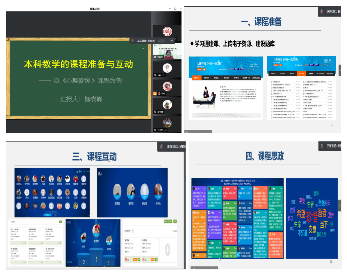 杨晓峰老师以《心理咨询》课程为例,从课程准备、课程互动和课程思政三个方面做了分享。课程准备从两方面进行,不仅要“备教材”,也要“备学生”。“备教材”是在熟悉课程内容、课程大纲、培养目标、考核方式、教学模式的基础上,在内师在线平台建设好课程,做好电子资料、建设题库、线上资源的推送工作。“备学生”是要进行学情分析。目前,存在学生动力不足、学习兴趣低下、机械学习、理论与实践脱节、死记硬背应付考试等情况,再加上线上教学,学生参与度不高可能是最大的问题。对此,如何引入科学的教学理念,如何通过教学模式的改革来激发学生学习动机,使学生由“要我学”转变为“我要学”甚至“我会学”,是本课程教学中的最大“痛点”。杨老师以OBE教学理念为基础,强调以“教”为中心的传统模式向以“学”为中心的新模式的转变,强调人人都能成功,强调精熟,给每个学生提供适宜的学习机会。采用对分课堂的教学模式,要求学生在课后自主学习、合作学习、深度讨论、归纳总结。课程互动采用签到、选人、抢答的形式进行讨论,讨论完形成对分。课程章节当中融入课程思政,通过对当前发生的热点问题的讨论,既对学生进行生命教育,又将生命教育和心理咨询、甚至怎么做人教育进行有机的结合。