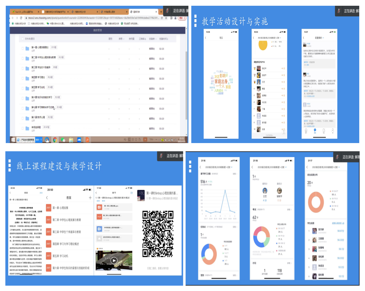 解翠玲老师从《中学教育心理学》公共课开学前的集体备课,教案、课件、题库、教学视频、扩展文献等线上教学资源的完善等方面做了分享。线上课程建设与教学设计方面,教师按照自己的教学需求把资源编排到课程当中。将电子版教材、短视频等资源利用学习通布置给学生学习。教研室的老师们齐心协力建立完善题库,并在学习通里任意组合试卷,方便课堂测试。教学活动设计与实施方面,将本课程与教师资格证考试和教师招聘考试结合,调整教学重难点。针对公共课性质,老师们想方设法提高每一节课的效率,提高学生的趣味性,让学生尽可能的在课程上有更大收获。