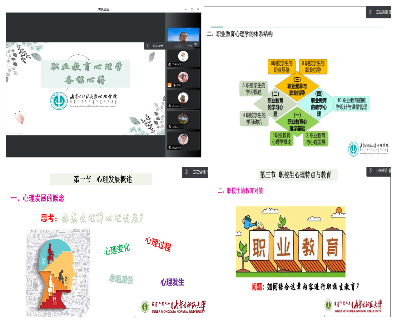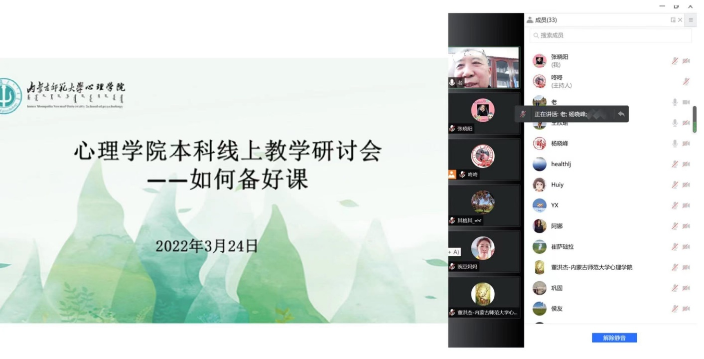 为了进一步提升线上教学效果,促进本科教学质量,3月24日下午,在各教研室充分开展线上教学研讨的基础上,万象城娱乐awc线路召开“如何备好课”——本科线上教学研讨会。学院党委书记七十三、院长乌云特娜、党委副书记张晓阳、副院长侯友及全体教师参加。心理学系主任杨晓峰、中学教育心理学教研室主任解翠玲、职业教育心理学教研室主任董洪杰、心理健康教育教研室主任赵媛分别做了经验交流和分享。