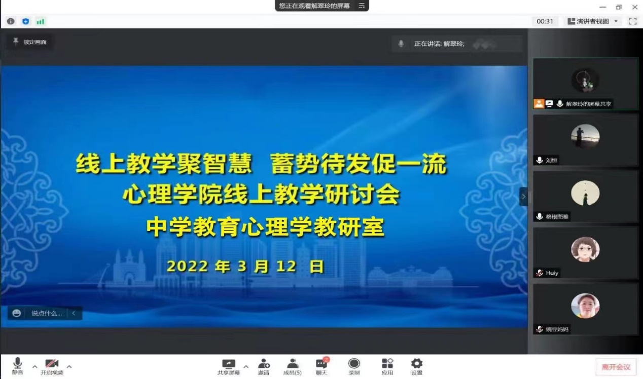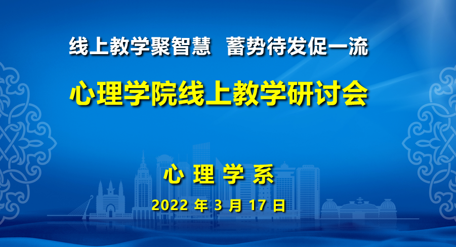 为进一步加强万象城线上教学组织管理工作,全力保障线上教学质量,按照学校相关要求,3月12日-17日,学院心理学系、中学教育心理学教研室和职业教育心理学教研室分别以“线上教学聚智慧,蓄势待发促一流”为主题召开了线上教学工作交流研讨会。