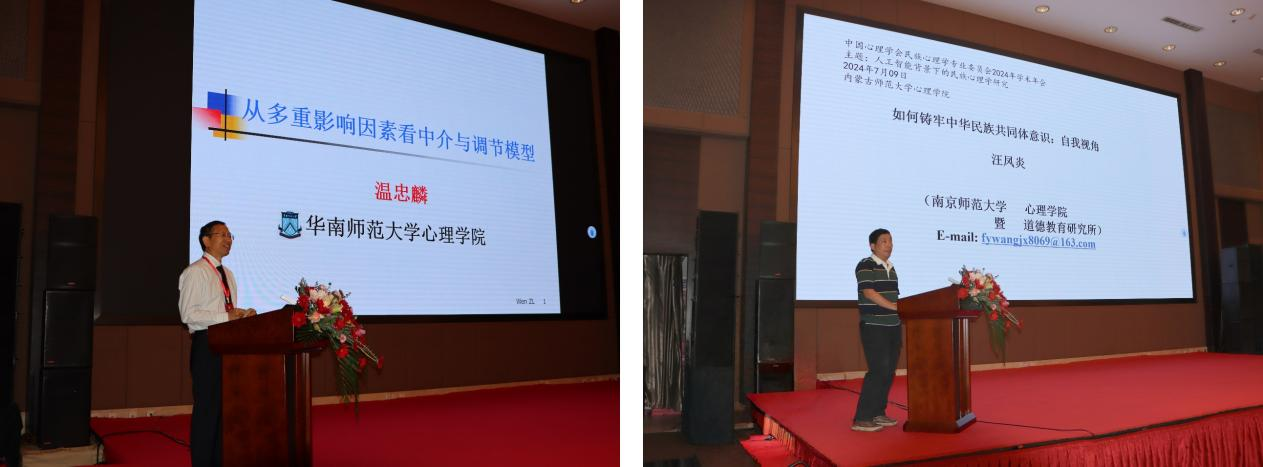 开幕式后,华南师范大学温忠麟教授、南京师范大学汪凤炎教授、上海交通大学李卫东教授、浙江大学周宵研究员和万象城娱乐awc线路王欣瑜教授分别就《从多重影响因素看中介与调节模型》、《如何铸牢中华民族共同体意识:自我视角》、《AI 与脑机交互技术在抑郁中的探索研究》、《青少年创伤心理的变化特征及代际影响》和《深层文化结构视阈下的中国心理学本土化省思》等议题做了五场特邀报告,分享了民族心理学国内前沿科研成果和实践经验,为与会者奉献了一场高水平的饕餮盛宴。